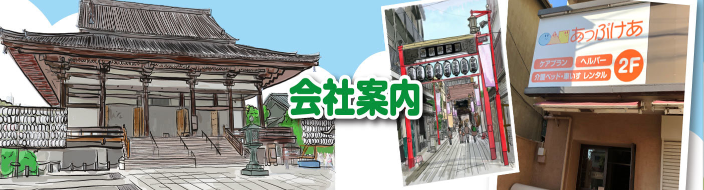 | 事業所 | ■あっぷけあ大師前(居宅介護支援) 事業所番号:1372112258 TEL:03-5809-5118 FAX:03-5809-5131 ■あっぷけあ大師前(訪問介護) 事業所番号:1372112241(訪問介護・介護予防) 事業所番号:13A2100561(介護予防・日常生活支援総合事業) 事業所番号:1312103839(居宅介護・重度訪問介護・移動支援事業) TEL:03-5809-5183 FAX:03-5809-5187 ■あっぷけあ足立西(福祉用具貸与・販売、住宅改修) 事業所番号:1372112266 TEL:03-5809-5189 FAX:03-5809-5199 |